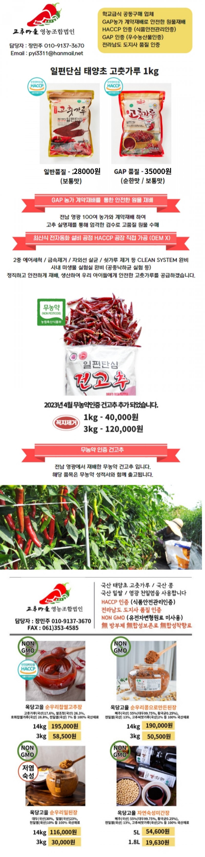 단가 영광 고추마을영농조합법인 ♥GAP★고추가루학교급식공동구매업체★5월 인증고춧가루♥ 단가입니다!★