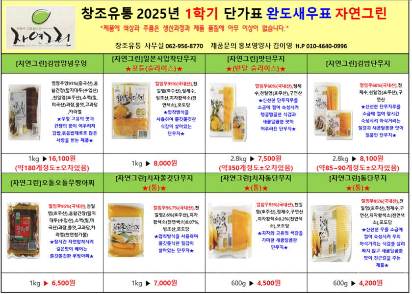 ▣ ▣ (주)창조유통 12~2월자연그린긴급공지▣ ▣ 자연그린 "오돌오돌 무짱아찌" 공급중단 페이지 정보 작성자 창조유통 댓글 0건 조회 93회 작성일 25-11-11 08:49 본문 목록 이전글♥♥저탄소·HACCP 인증 | 더자람 우리아이 건강간식 ★치즈케이크★ 25.11.11 다음글♥덕유공산12월(닭)단가표♥닭목살물결후라이드,갈릭꼬꼬소금구이,옛날통닭,숯불치꼬치킨,블랙알리오치킨,매콤왕중왕치킨,달콤갈비치킨,뿌링뿌치,수원왕갈비통닭 25.11.10 댓글목록 댓글목록 등록된 댓글이 없습니다.