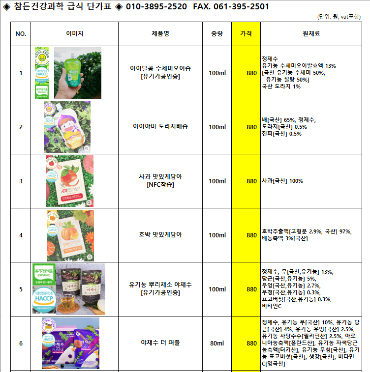 ★☆★ 참든건강과학(건강음료,건강즙(파우치) 전문) ★☆★ 8~10월 단가표 사과즙 공급 가능 페이지 정보 작성자 참든 댓글 0건 조회 132회 작성일 23-08-11 14:56 본문 안녕하세요! 참든건강과학 8~10월 단가표 공유드립니다.사과즙(사과맛있게담아)은 공급 가능합니다. 목록 이전글신세계푸드9월 총단가표입니다..(수정분) 23.08.11 다음글⊙⊙[변동] 나결FS 9월 총 단가표⊙⊙ 푸드스토리,싱싱플러스,푸름,한국전통떡,착한애,명가푸드,목우촌,가보팜스,학교간닭,우리밀로,푸르온,루토사,천일,하이포크가족사랑 전체단가 23.08.11 댓글목록 댓글목록 등록된 댓글이 없습니다.
