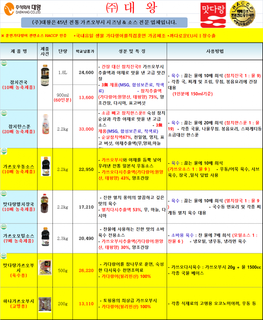 8월>대왕 단가표,---참치한스푼,해물한스푼,참치진국,가쓰오우동소스, 하나가쓰오부시(고명용 페이지 정보 작성자 호남푸드 댓글 0건 조회 155회 작성일 23-06-28 09:15 본문 목록 이전글8월>삼양모닝스쿨-- 고구마떡갈비,허브함박,오징어가득해물완자,고기완자,귀리영양가득미트볼,바삭야채튀김,깻잎가득동그랑땡 23.06.28 다음글8월>가온누리-(대구특산물납작만두,우리밀통팥찐빵,츄러스,쫄깃한감자호떡,씨앗감자호떡,궁중찹쌀떡,파이시트,애플턴오버생지 23.06.28 댓글목록 댓글목록 등록된 댓글이 없습니다.