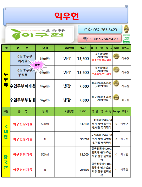 ●송곡푸드● 익우헌(찌개용두부 , 부침용두부) 새학기 3월 단가표