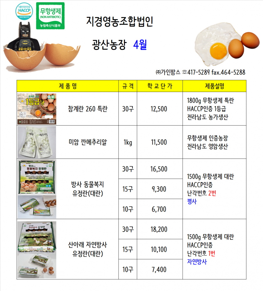 축산물 【참계란】 지경영농조합법인 광산농장 1등급특란, 2번유정란, 1번유정란, 미암깐메추리알 23년 4월 단가표 페이지 정보 작성자 산들 댓글 0건 조회 224회 작성일 23-03-15 11:04 본문 ♥전라도 생산 계란!!♥♥신선하고 건강한 계란을 만나보세요♥ 목록 이전글★고추가루학교급식공동구매업체★23년 4월 단가 영광 고추마을영농조합법인 ♥GAP인증고춧가루♥ 단가입니다!★ 23.03.15 다음글【산들오리】 오리슬라이스, 절단육, 탕용정육, 훈제, 완포 23년 4월 단가표 올립니다. 23.03.15 댓글목록 댓글목록 등록된 댓글이 없습니다.