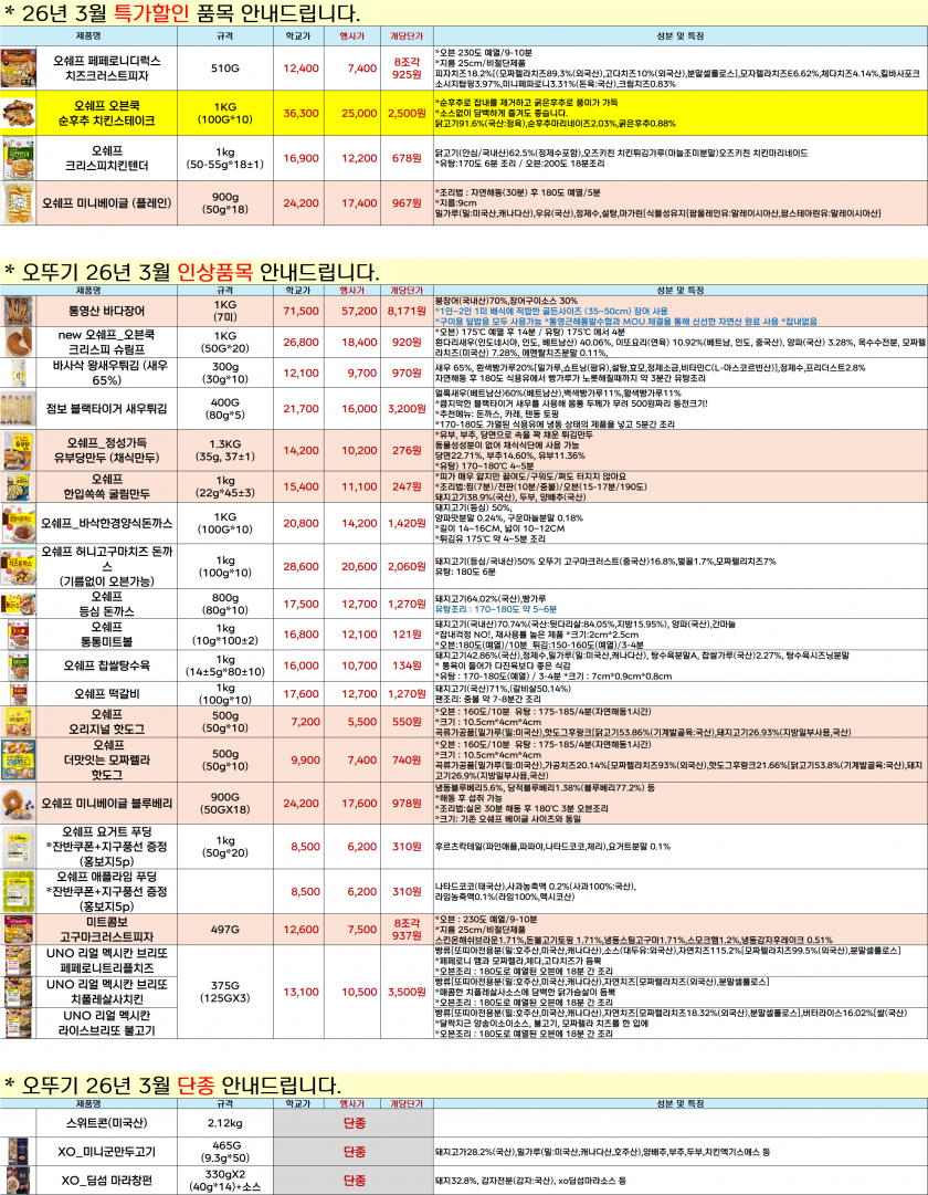 ★★★ 오뚜기 3월 단가인상&인하&단종 공지(피클류 인상추가!!!!) ★★★ 페이지 정보 작성자 오뚜기 댓글 4건 조회 314회 작성일 26-02-09 11:22 본문 안녕하세요, 선생님오뚜기입니다.3월 단가 인상&인하&단종 확인부탁드리겠습니다.감사합니다. 첨부파일 오뚜기 26년 3월 할인인상단종 단가표.xlsx (887.8K) 93회 다운로드 | DATE : 2026-02-10 10:41:55 목록 이전글나결fs SRC4월**(1일만우절,5일식목일,22일지구의날),크런치청파래오징어까스,찐한우소머리곰탕 26.02.09 다음글▶▷-♣도래샘푸드❤️❤️❤️=>하늘빛,슬로우메이드(26년 03월 선발주공지) (2월13일마감) 두바이 딥 초코케익❤️❤️❤️ 26.02.09 댓글목록 댓글목록 솔라씨님의 댓글 솔라씨 작성일 26-02-09 14:06 댓글내용 확인 비밀글 입니다. 오뚜기님의 댓글의 댓글 오뚜기 작성일 26-02-10 10:49 댓글내용 확인 비밀글 입니다. gjdbwls님의 댓글 gjdbwls 작성일 26-02-09 15:38 댓글내용 확인 비밀글 입니다. 오뚜기님의 댓글의 댓글 오뚜기 작성일 26-02-10 10:50 댓글내용 확인 비밀글 입니다.