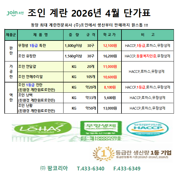 축산물 ★조인[누리웰] 26년 4월 단가표★무항1등급 특란[12,100원]•무항깐달걀[11,000원]•무항깐메추리알[10,600원]