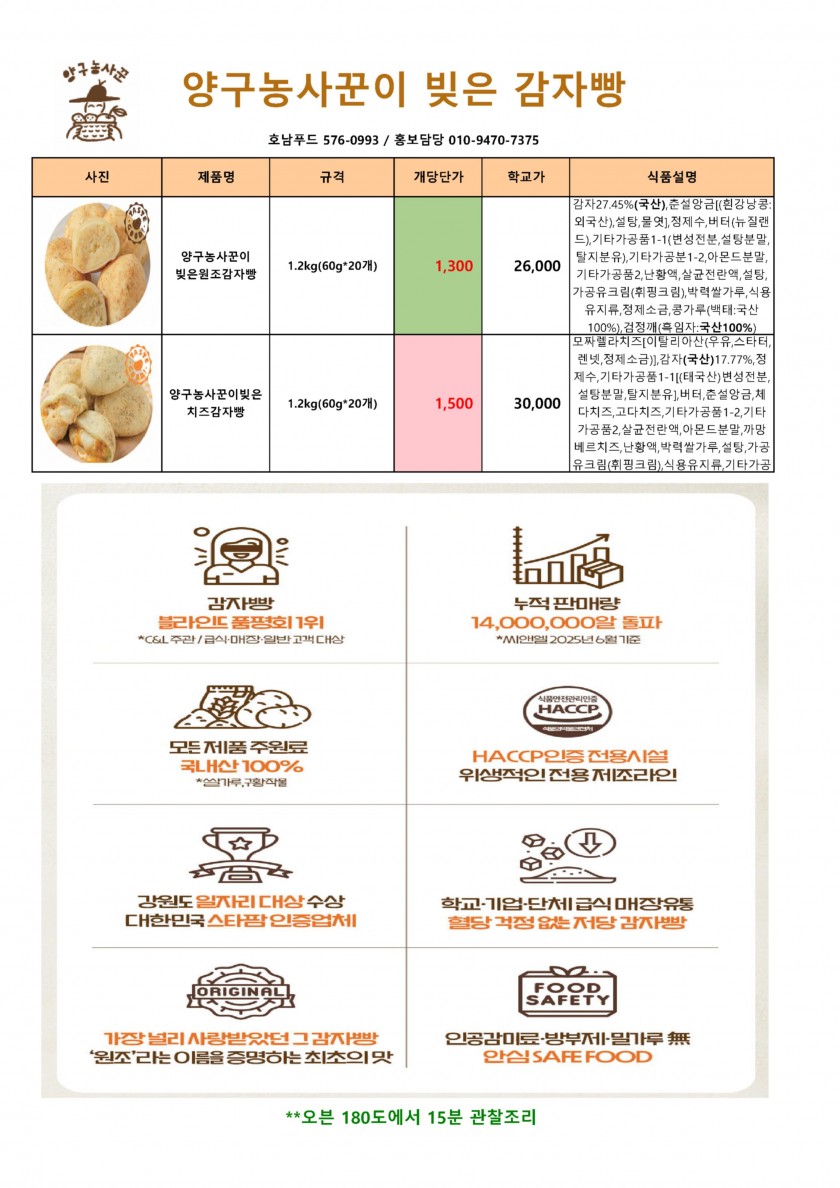 호남푸드)♥양구농사꾼 1~2월 단가표˚♥양구농사꾼이 빚은 원조감자빵, 양구농사꾼이 빚은 치즈감자빵